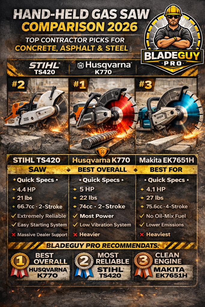 Hand-held gas saws are still the go-to cutting tool on construction sites. They deliver more cutting power and runtime than most battery models and handle concrete, asphalt, rebar, pipe, and masonry with ease.