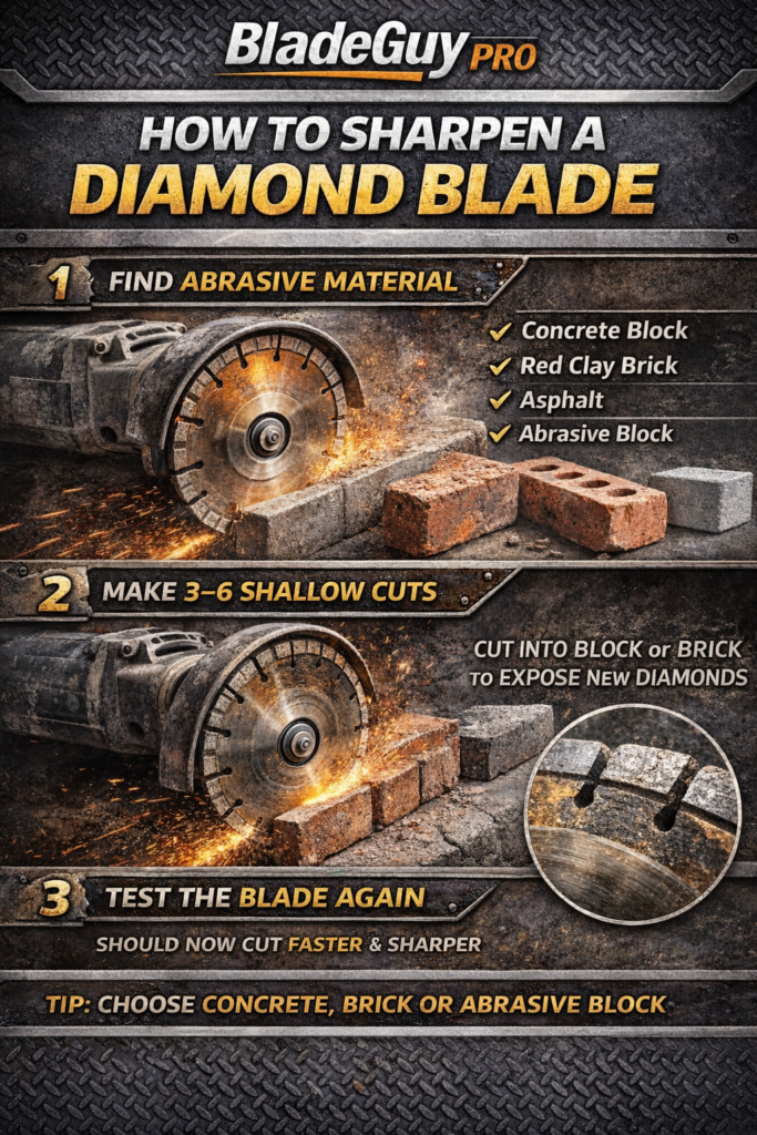 By dressing the blade with an abrasive material, you can expose fresh diamonds and restore cutting performance in about 60 seconds.