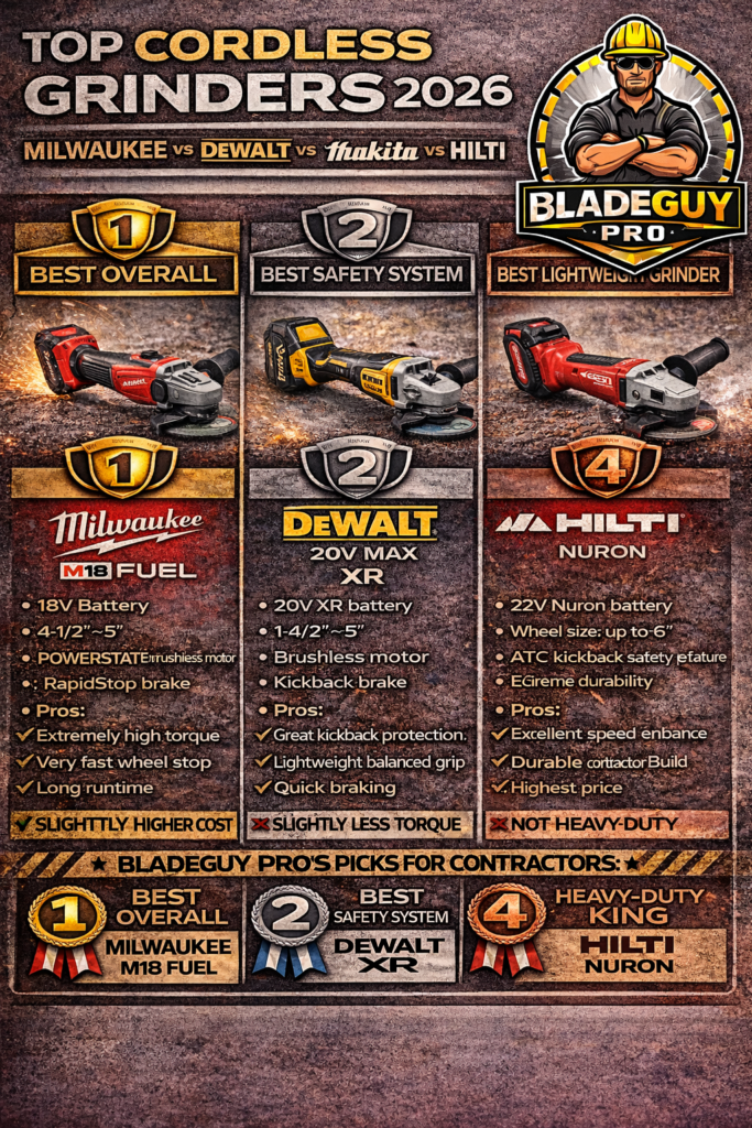 Milwaukee’s M18 Fuel grinders are widely used on construction sites because they deliver corded-level power with strong battery runtime.