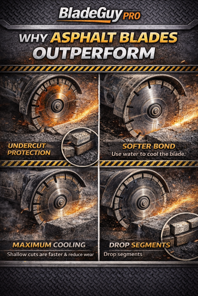 - Concrete or general-purpose blades can overheat, shatter, or kickback when used on asphalt.